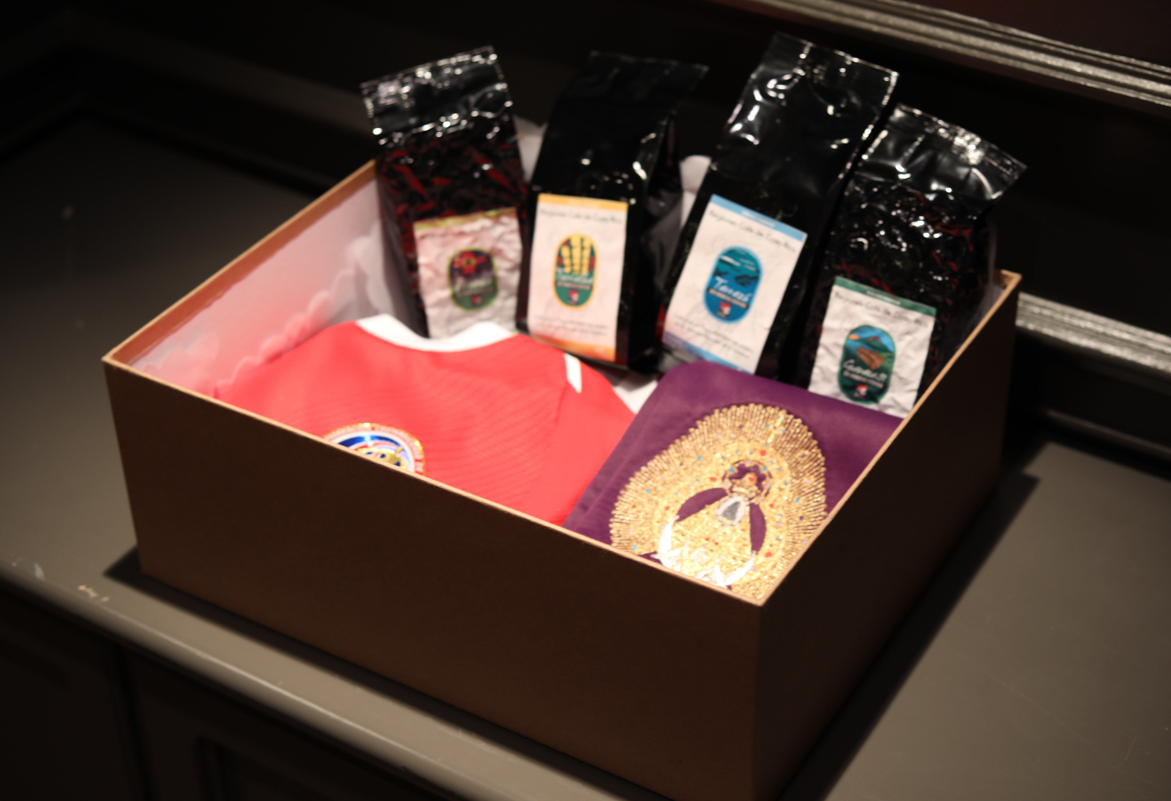 Los regalos estaban en una sola caja personalizada que Alvarado y su esposa, la primera dama Claudia Dobles, llevaron al líder de la iglesia Católica a Panamá, donde se realiza la Jornada Mundial de la Juventud 2019 (JMJ).