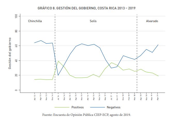 “El descontento actual se comporta siguiendo el patrón cíclico de mayor desaprobación durante el segundo año de gobierno. Las cifras actuales son similares al máximo porcentaje de descontento que se registró durante el gobierno de Luis Guillermo Solís, en agosto del 2015”, nota el documento.