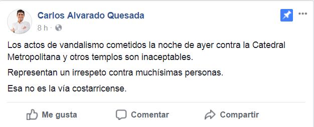 El postulante oficialista, Carlos Alvarado, calificó de "inaceptables", los grafitis pintados en los exteriores de los templos católicos y aseguró que son un "irrespeto contra cientos de miles de costarricenses".