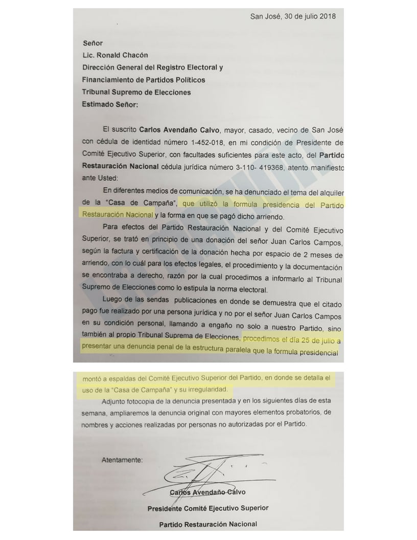 El 30 de julio, el presidente del PRN envió una carta al TSE en la que dice: “Procedimos el día 25 de julio a presentar una denuncia penal de la estructura paralela que la fórmula presidencial montó a espaldas del Comité Ejecutivo Superior, en donde se detalla el uso de la casa de campaña y su irregularidad”.