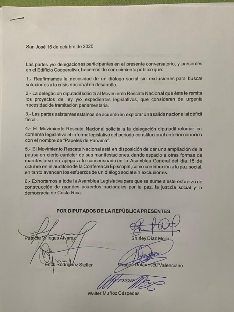 En un documento firmado luego de varias horas de reunión con el movimiento de los manifestantes, de varios sindicalistas y el Movimiento Cooperativo, cinco diputados se comprometieron a promover en la Asamblea Legislativa los proyectos que les pidan desde Rescate Nacional.