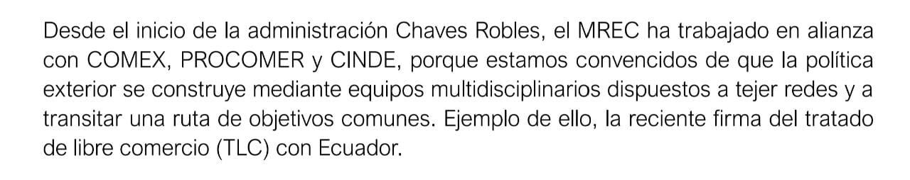 En el informe de labores, Chaves aseguró que la alianza entre el Ministerio de Comercio Exterior (Comex), la Promotora de Comercio Exterior (Procomer) y Cinde fue fructífera, y puso como ejemplo la firma del Tratado de Libre Comercio (TLC) con Ecuador.