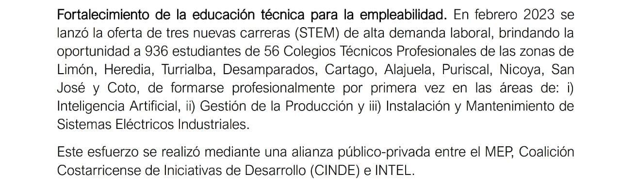 El presidente Chaves también reconoció en su informe de labores el papel conjunto que desempeñaron Cinde, el Ministerio de Educación Pública (MEP) e Intel para fortalecer la educación técnica y las carreras orientadas a la ciencia y la tecnología.