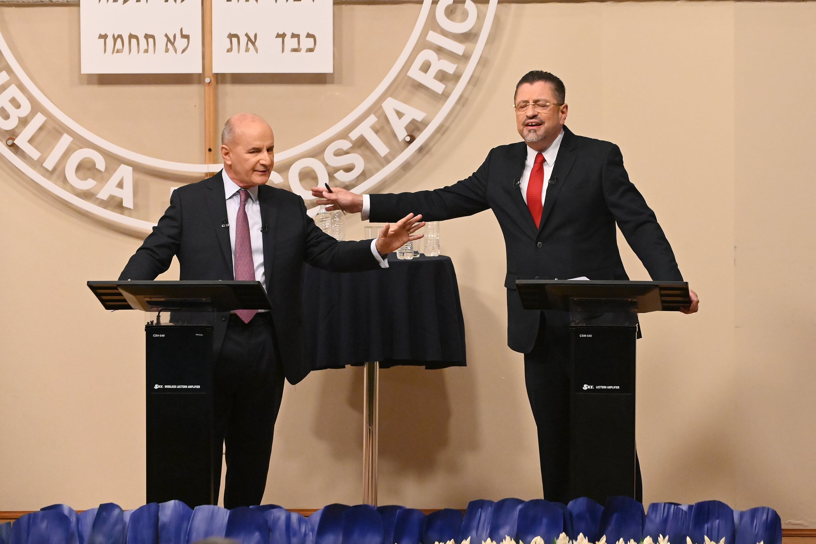 Los candidatos Rodrigo Chaves y José María Figueres en enfrascaron en una discusión por desmarcarse de cualquier vínculo con el Partido Acción Cuidada (PAC), durante el debate organizado por Columbia y la Universidad Hispanoamericana.