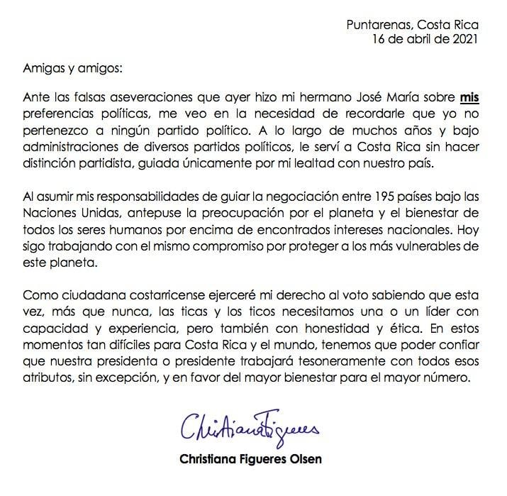 “Como ciudadana costarricense, ejerceré mi derecho al voto, sabiendo que esta vez, más que nunca, las ticas y los ticos necesitamos a un líder con capacidad y experiencia, pero también con honestidad y con ética”, dijo Christiana Figueres en un video publicado en redes sociales.