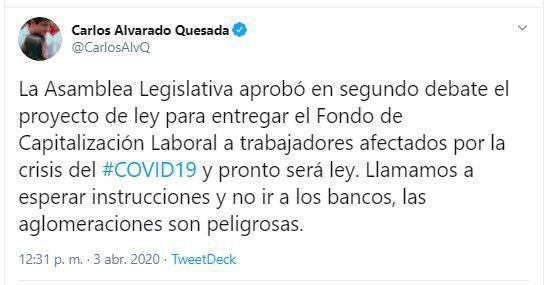 Luego de que el Congreso dio su último aval al plan, el presidente Alvarado llamó a los ciudadanos a no ir todavía a los bancos y a esperar instrucciones para tramitar el FCL. “Las aglomeraciones son peligrosas”, advirtió en un mensaje enviado en sus redes sociales.