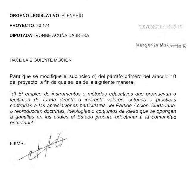 Acuña propone prohibir: d) El empleo de los instrumentos o métodos educativos que promuevan o legitimen de forma directa o indirecta valores, criterios o prácticas contrarias a las apreciaciones particulares del PAC o reproduzcan doctrinas, ideologías o conjuntos de idea que se opongan a aquellas en las cuales el Estado procura adoctrinar a la comunidad estudiantil.