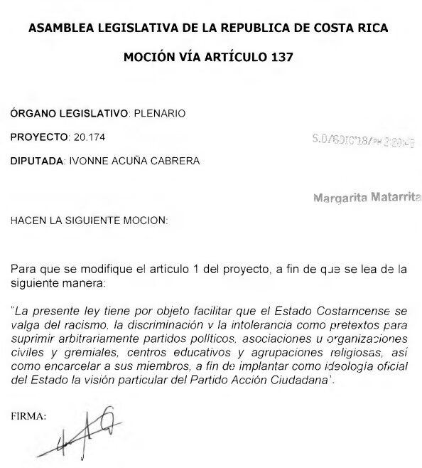 El propuesto: Artículo 1. La presente ley tiene por objeto facilitar que el Estado Costarricense se valga del racismo, la discriminación y la intolerancia como pretextos para suprimir arbitrariamente partidos políticos, asociaciones u organizaciones civiles y gremiales, centros educativos y agrupaciones religiosas, así como encarcelar a sus miembros a fin de implantar como ideología oficial del Estado la visión particular del PAC.