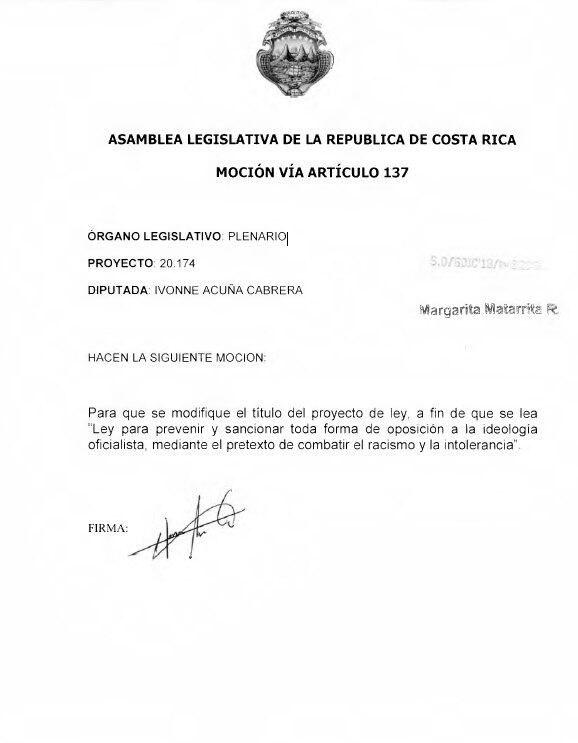 Acuña propone que en vez de llamarse “Ley marco para prevenir y sancionar todas las formas de discriminación, racismo e intolerancia”, el proyecto se llame “Ley para prevenir y sancionar toda forma de oposición a la ideología oficialista, mediante el pretexto de combatir el racismo y la intolerancia”.