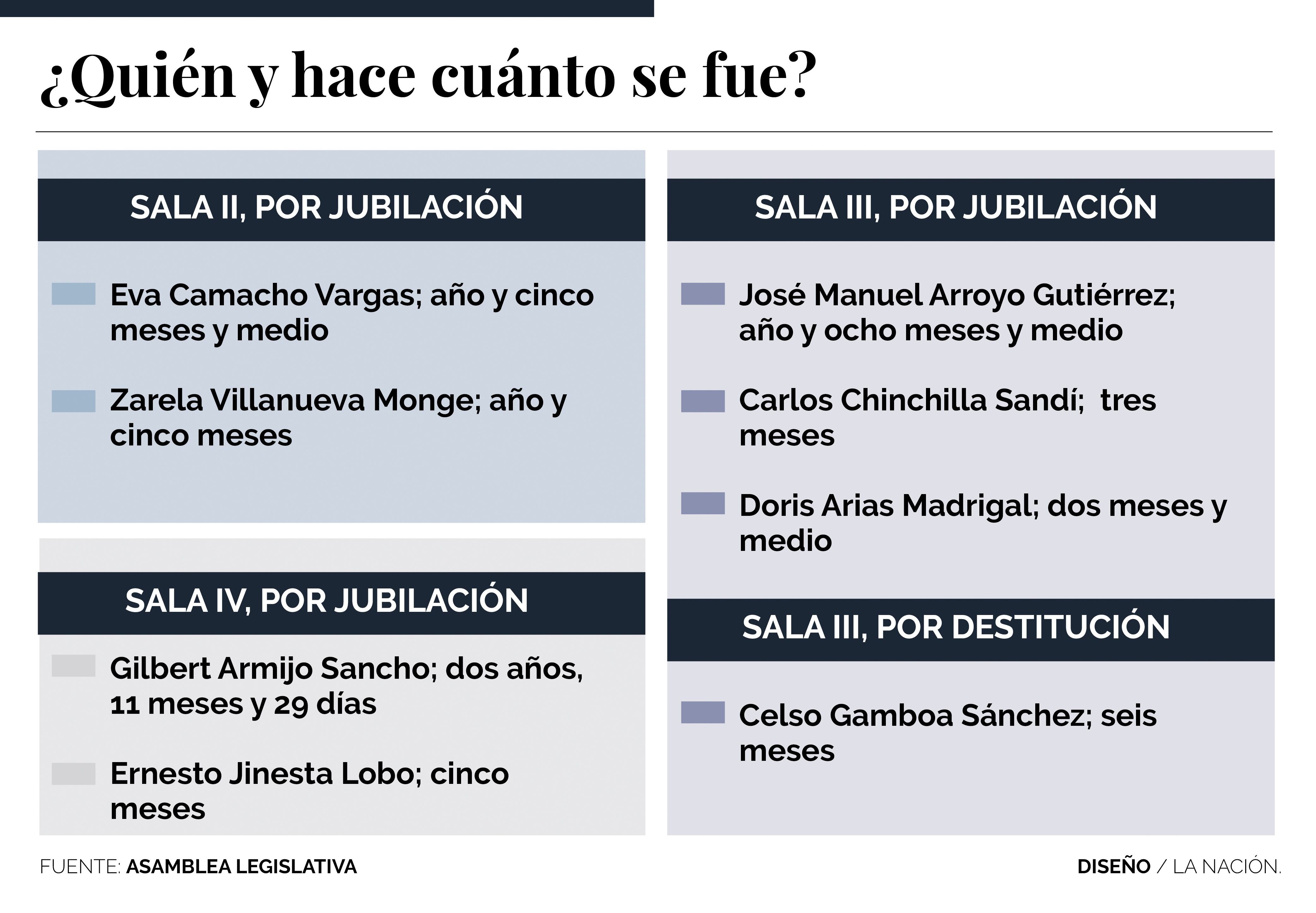De las ocho plazas vacías, además, la mitad corresponde a la Sala Tercera, encargada de los asuntos penales. Tres cargos de magistrado están vacantes por las respectivas jubilaciones de José Manuel Arrroyo, el 1.° de enero del 2017; de Carlos Chinchilla, el 16 de julio del 2018, y de Doris Arias Madrigal, el 30 de julio de este año.