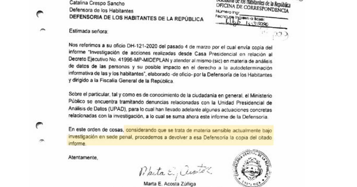 El 11 de marzo, Acosta le respondió a la defensora de los Habitantes: “Sobre el particular, tal y como es de conocimiento de la ciudadanía en general, el Ministerio Público se encuentra tramitando denuncias relacionadas con la UPAD, para lo cual han llevado adelante algunas actuaciones concretas relacionadas con la investigación, a lo cual se suma este informe de la Defensoría”.