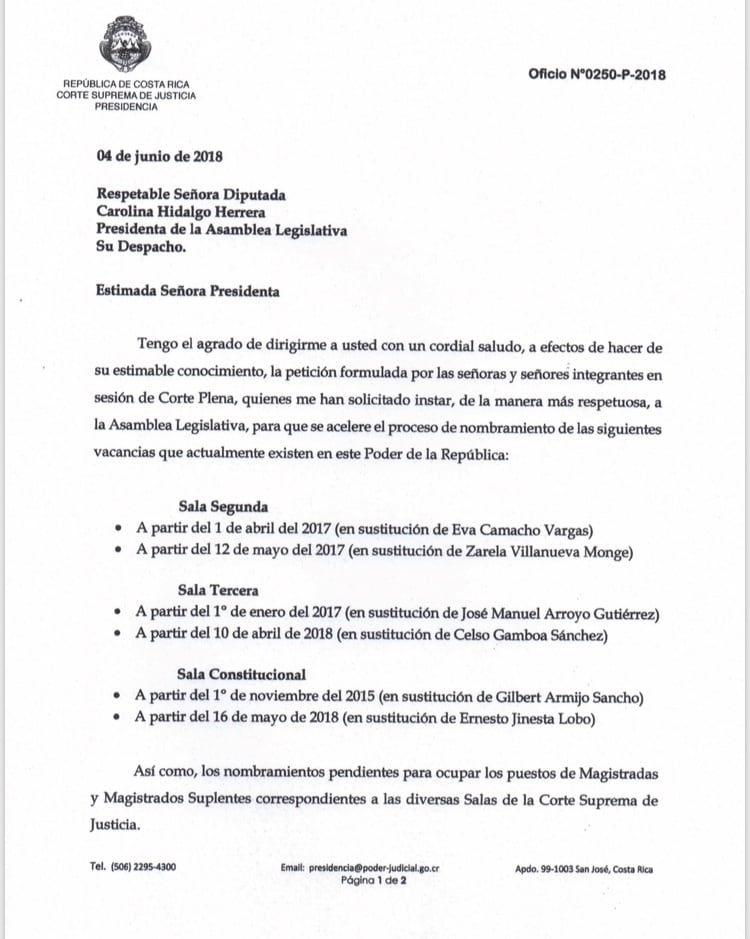 Así consta en el oficio 0250-P-2018, fechado el 4 de junio, y firmado por el entonces presidente de la Corte, Carlos Chinchilla, quien le recuerda a Hidalgo las seis vacantes que había en ese momento, dos en la Sala Segunda, dos en la Tercera y dos en la Constitucional.