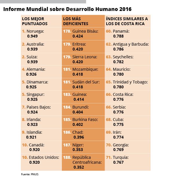 Con esas condiciones, Costa Rica alcanzó un índice de desarrollo humano de 0,776; calificación que la ubica en la posición número 66 del ranquin mundial, y 5 en América Latina. En el último lustro, el país logró subir tres posiciones.
