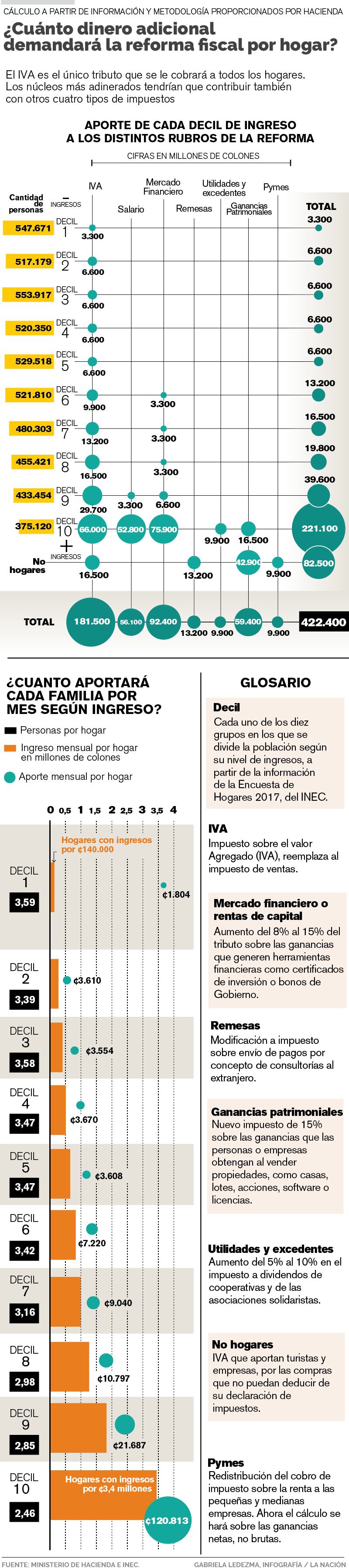 Con base en cálculos suministrados por el Ministerio de Hacienda, este medio estimó el impacto que la reforma tendría en cada uno de los diez estratos que conforman la población costarricense según el nivel de ingreso de los hogares.