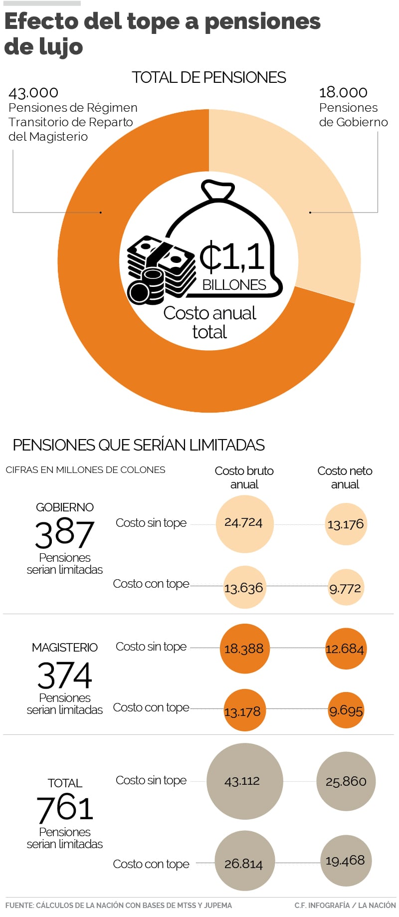 En suma, en caso de que la Sala IV declare constitucional el tope sobre estas 761 jubilaciones de Gobierno y Magisterio, el costo neto pasaría de ¢25.860 millones a ¢19.500 millones para los contribuyentes.