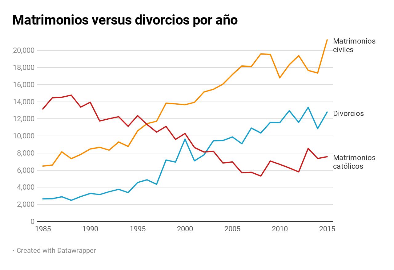 Mientras en 1985 se registraba un divorcio por cada siete matrimonios, en el 2015 la relación era prácticamente un divorcio por cada dos matrimonios.