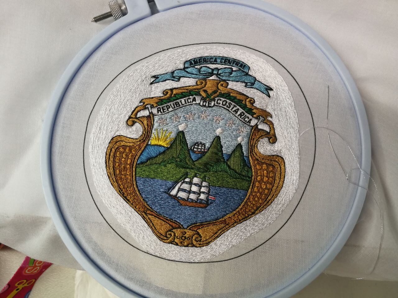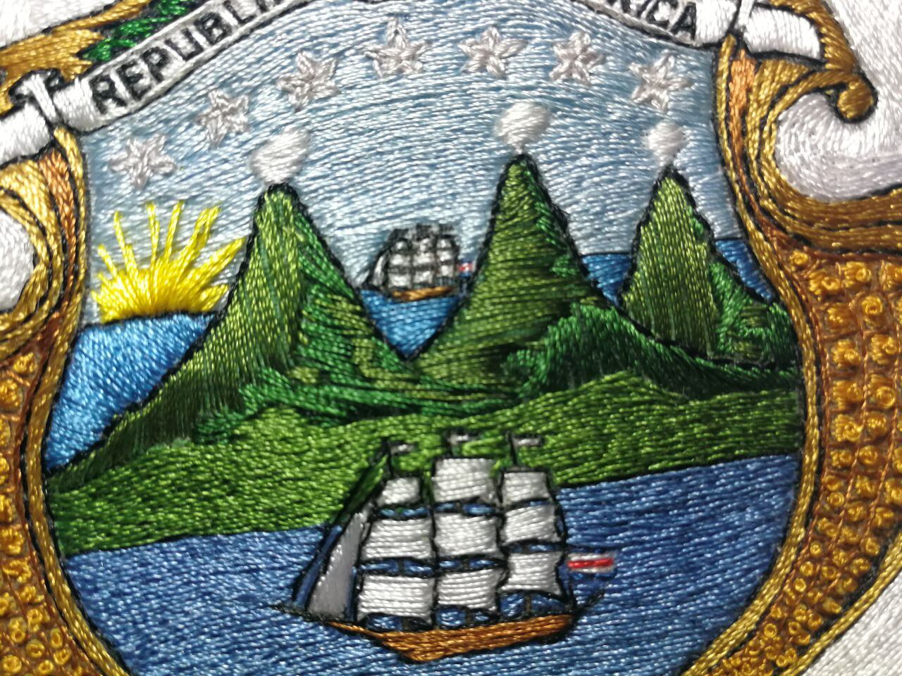 Después de más de 100 horas de trabajo y sin cobrar un colón, María del Rosario Camacho Badilla está a punto de terminar de bordar el escudo de la banda presidencial que Carlos Alvarado portará el próximo 8 de mayo al asumir el poder. Es la banda del bicentenario.