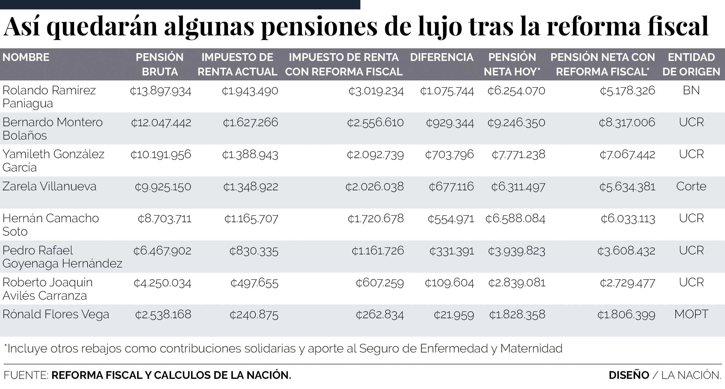Actualmente, la pensión bruta de Ramírez es de ¢13,9 millones y, con deducciones, baja a ¢6,2 millones. De ser aprobado el plan fiscal, este beneficio se reduciría a ¢5,1 millones.