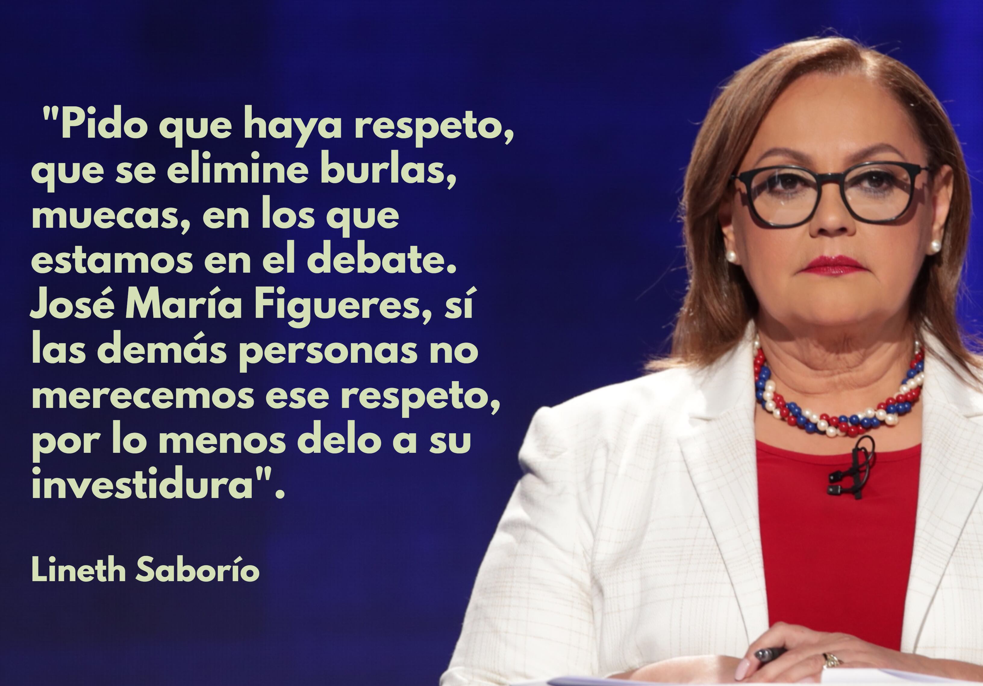 Lineth Saborío, candidata del PUSC, le pidió un minuto a Ignacio Santos, cuando le tocó la palabra por primera vez. Santos se lo negó porque no estaba previsto. Entonces, Saborío aprovechó su tiempo, en el que debía hablar de pobreza, para exigir respeto a su contendor José María Figueres: “Pido que haya respeto, que se eliminen burlas, muecas en los que estamos en el debate. José María Figueres, si las demás personas no merecemos ese respeto, por lo menos a su investidura”.