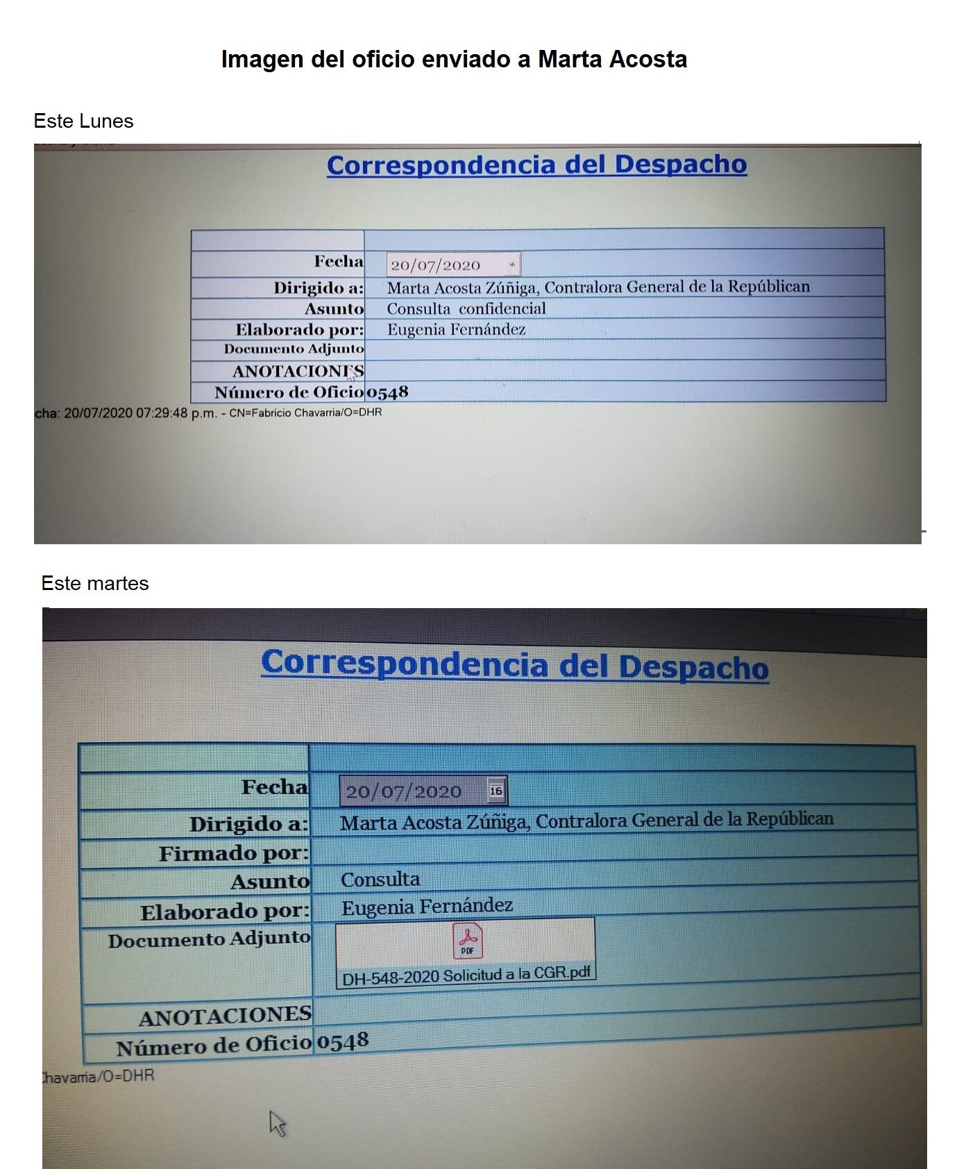 Se trata del oficio DH-548-2020 que Crespo le envió el 21 de julio a la contralora general de la República, Marta Acosta, para solicitarle información sobre la normativa que regula el quehacer del Consejo Consultivo de la Contraloría General de la República.