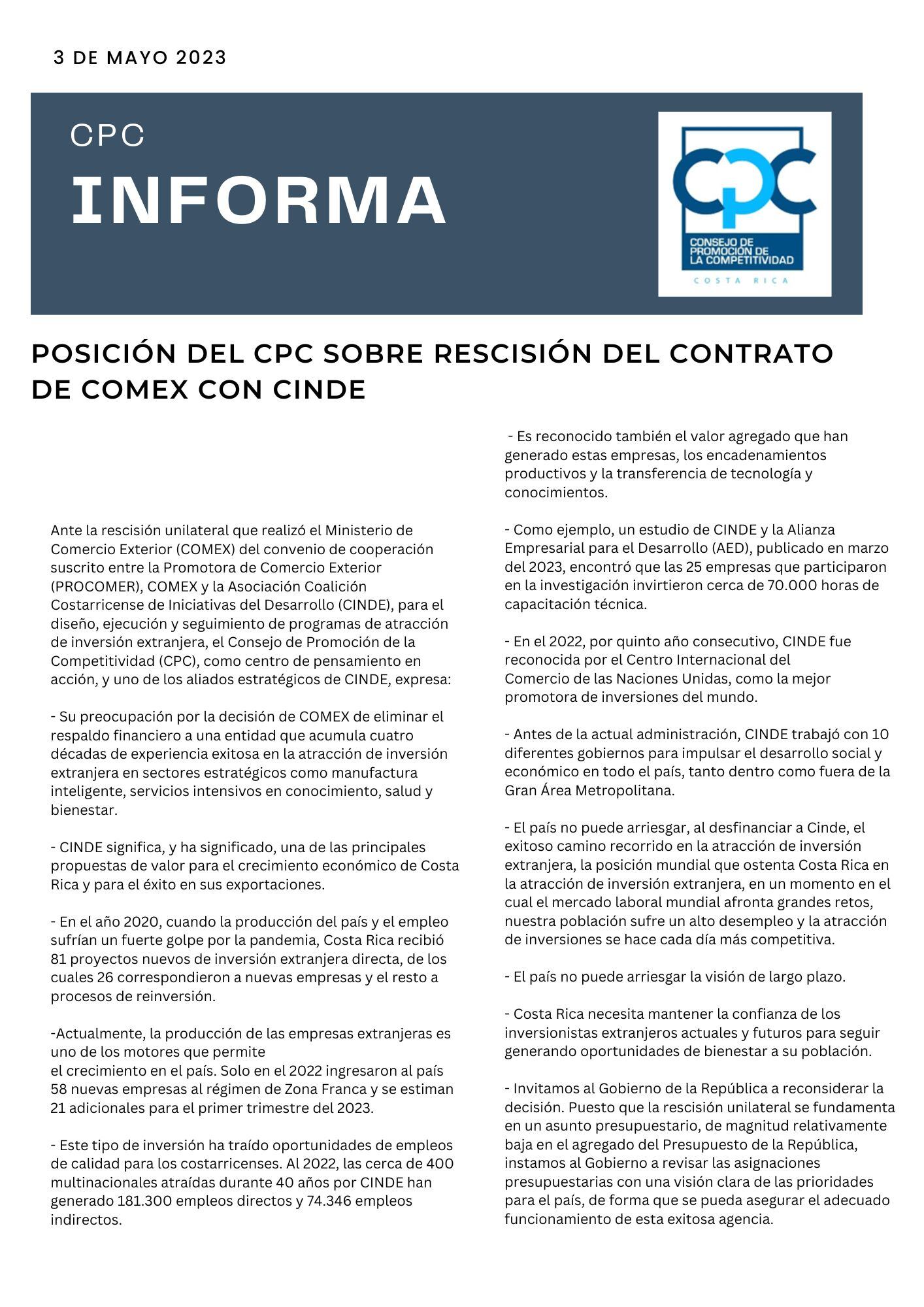El Consejo de Promoción de la Competitividad (CPC), organización que agrupa a empresas nacionales y firmas extranjeras radicadas en Costa Rica, externó su preocupación por la decisión del Gobierno de romper unilateralmente el convenio con la Coalición Costarricense de Iniciativas de Desarrollo (Cinde), mediante el cual se atrae inversión extranjera directa al país.
