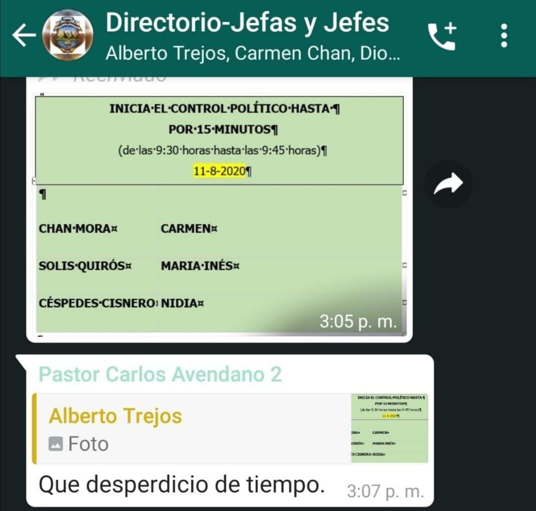 A las 3:07 p. m., una captura de pantalla muestra una respuesta de un número de Whatsapp identificado como “Pastor Carlos Avendaño”, que literalmente decía: “Que desperdicio de tiempo”.