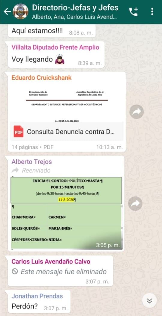 La diputada Nidia Céspedes, del bloque independiente Nueva República, denunció este martes comentarios machistas escritos por Carlos Avendaño en un grupo legislativo de Whatsapp.