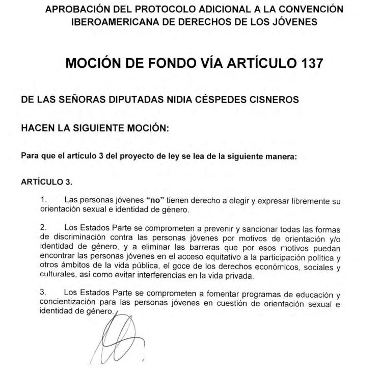 La versión propuesta por Nidia Céspedes dice, literalmente, así: “Las personas jóvenes ‘no’ tienen derecho a elegir y expresar libremente su orientación sexual e identidad de género”.