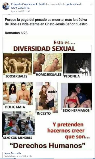 Justo el día de las elecciones nacionales, la publicación apareció con un encabezado con una cita bíblica, que habla sobre el pecado y su paga (la muerte), seguida por un frase que dice "Esto es... diversidad sexual". De inmediato, se muestran imágenes que pretenden ilustrar, al mismo nivel, las prácticas homosexuales con las zoosexuales, la pedofilia, la poligamia, el incesto, el sexo entre hermanos y el sexo con menores.