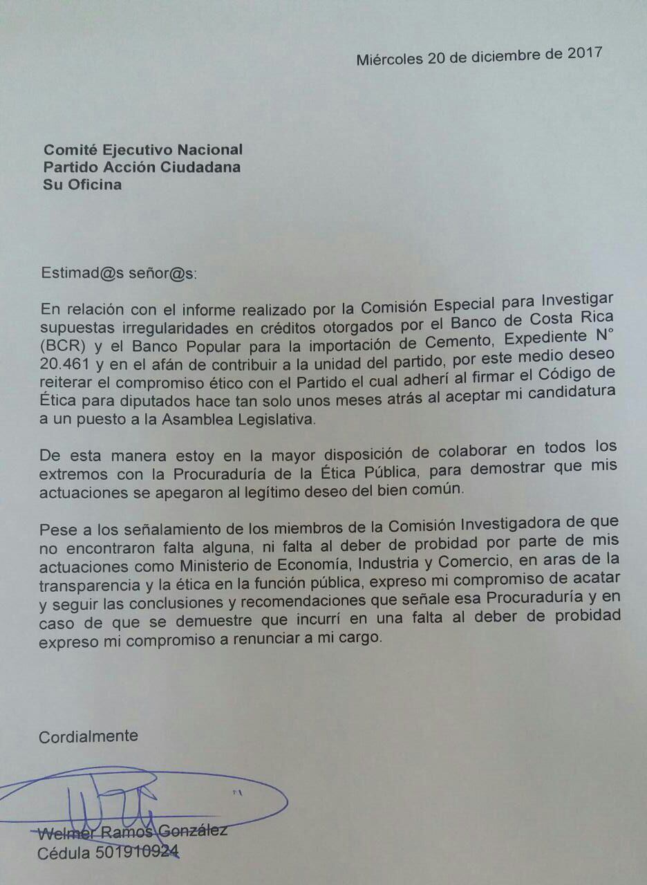 “Expreso mi compromiso de acatar y seguir las conclusiones y recomendaciones que señale esa Procuraduría y en caso de que se compruebe que cometí una falta al deber de probidad expreso mi compromiso a renunciar a mi cargo”, dice la misiva.