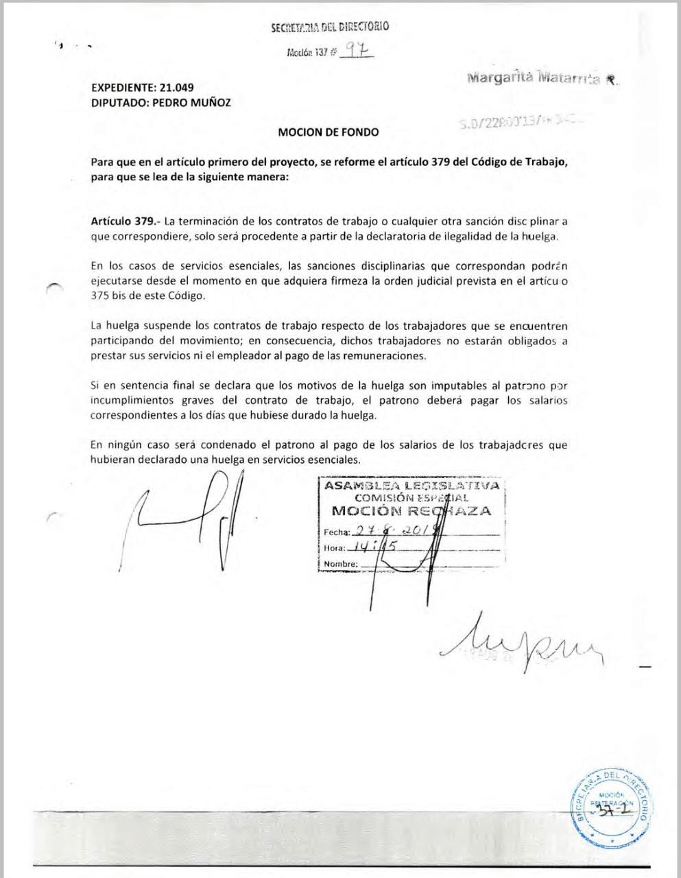 Durante el debate, Pedro Muñoz afirmó que su propuesta no era una novedad, pues la suspensión de salarios ya está establecida en el artículo 386 del Código de Trabajo, el cual establece que los patronos serán condenados a pagar los salarios correspondientes a los días de huelga si el movimiento se debió a un incumplimiento de su parte.