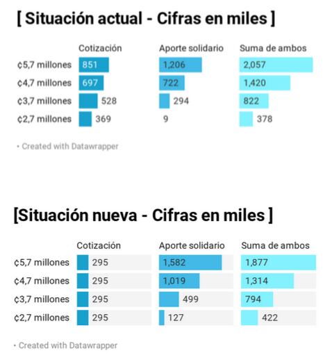 Por ejemplo, al que recibe ¢4,7 millones la contribución solidaria le subiría de ¢723.000 a poco más de ¢1 millón, pero a la vez la cotización bajaría de ¢700.000 a menos de ¢295.000. En suma, vería ¢105.000 a su favor con este proyecto.