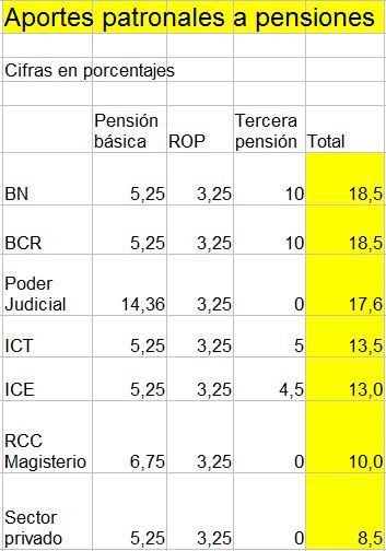 Algo similar ocurre con los funcionarios del Banco Nacional (BN) y del Banco de Costa Rica (BCR). Estos reciben un 18,5% distribuido de la siguiente forma: un 5,25% para la pensión básica, un 3,25% para la pensión del ROP y un 10% para una tercera pensión complementaria.