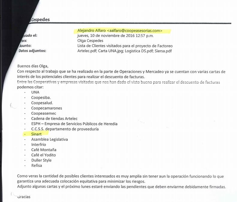 En el correo, el presidente de Coopeasesorías incluye al Sinart dentro de una lista de 15 empresas que le "han dado el visto bueno" para contratar sus servicios de factoreo. En el mensaje, también se menciona a la Asamblea Legislativa, a la Universidad Nacional (UNA) y a la Caja Costarricense del Seguro Social (CCSS).