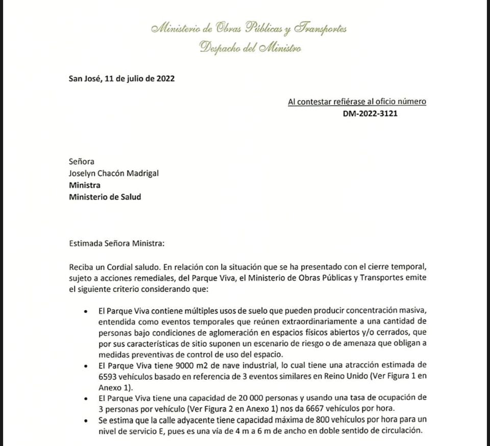 “(…) Así las cosas, mediante el oficio N.° MS-DM-5754-2022, este despacho ministerial, con carácter de urgencia, solicitó al señor Luis Esteban Amador Jiménez, en su condición de ministro de Obras Públicas y Transportes, y a la señora Laura Ulloa Albertazzi, viceministra de Transportes y Seguridad Vial, criterio técnico en relación con las calles de acceso al recinto comercial privado, denominado ‘Parque Viva’, ubicado en La Guácima de Alajuela, con el fin de dilucidar aspectos estructurales y de seguridad humana (…)”, consta en ese informe de descargo, tras el amparo presentado por periodistas de La Nación el 27 de julio anterior.