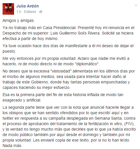La ahora exfuncionaria anunció su salida del Gobierno desde su cuenta en Facebook: "Ya no trabajo más en Casa Presidencial. Presenté hoy mi renuncia en el Despacho de mi superior: Luis Guillermo Solís Rivera. Solicité que se hiciera efectiva a partir de hoy mismo".