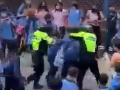 El policía y el alumno se enfrentaron y los demás estudiantes intentaron defender a su compañero y hacer que lo soltara; otros gritaban improperios contra los oficiales.