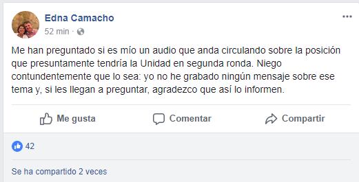 Camacho hizo una publicación en su página de Facebook, pasadas las 11 a. m., de este lunes, en la que asegura que la voz del audio no es la suya.