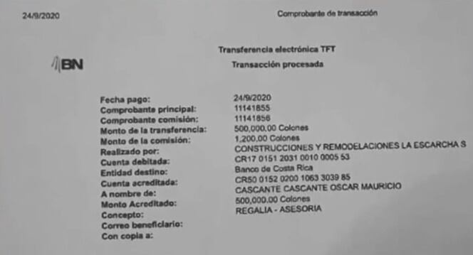 El dinero lo recibió en su cuenta del Banco de Costa Rica (BCR), de parte de una sociedad denominada Construcciones y Remodelaciones La Escarcha.