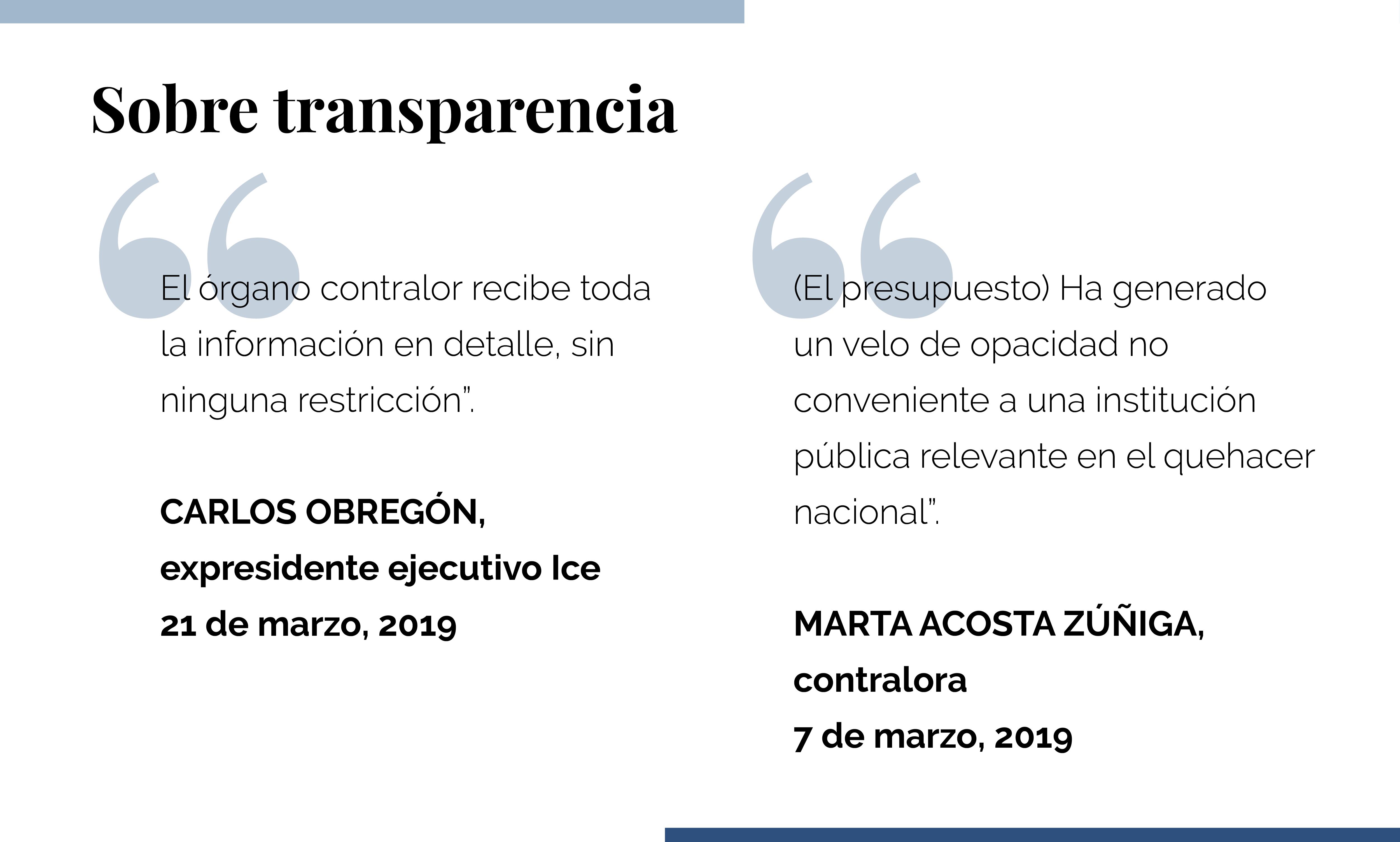 “Hoy ustedes no pueden ver el presupuesto del ICE en detalle; existe, pero sin desagregarse las cifras, con esto nunca hemos estado de acuerdo”, declaró Acosta el 7 de marzo anterior.