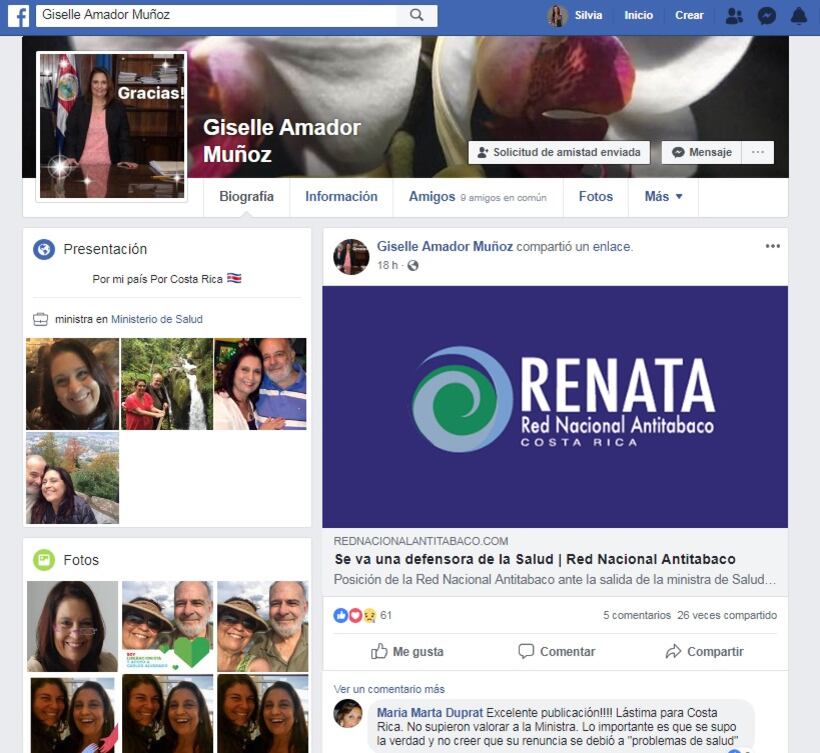 Este martes por la noche, la Red Nacional Antitabaco (Renata) envió un comunicado titulado “Se va una defensora de la salud”, el cual, incluso, fue compartido por la misma exministra Amador en su cuenta personal de Facebook.