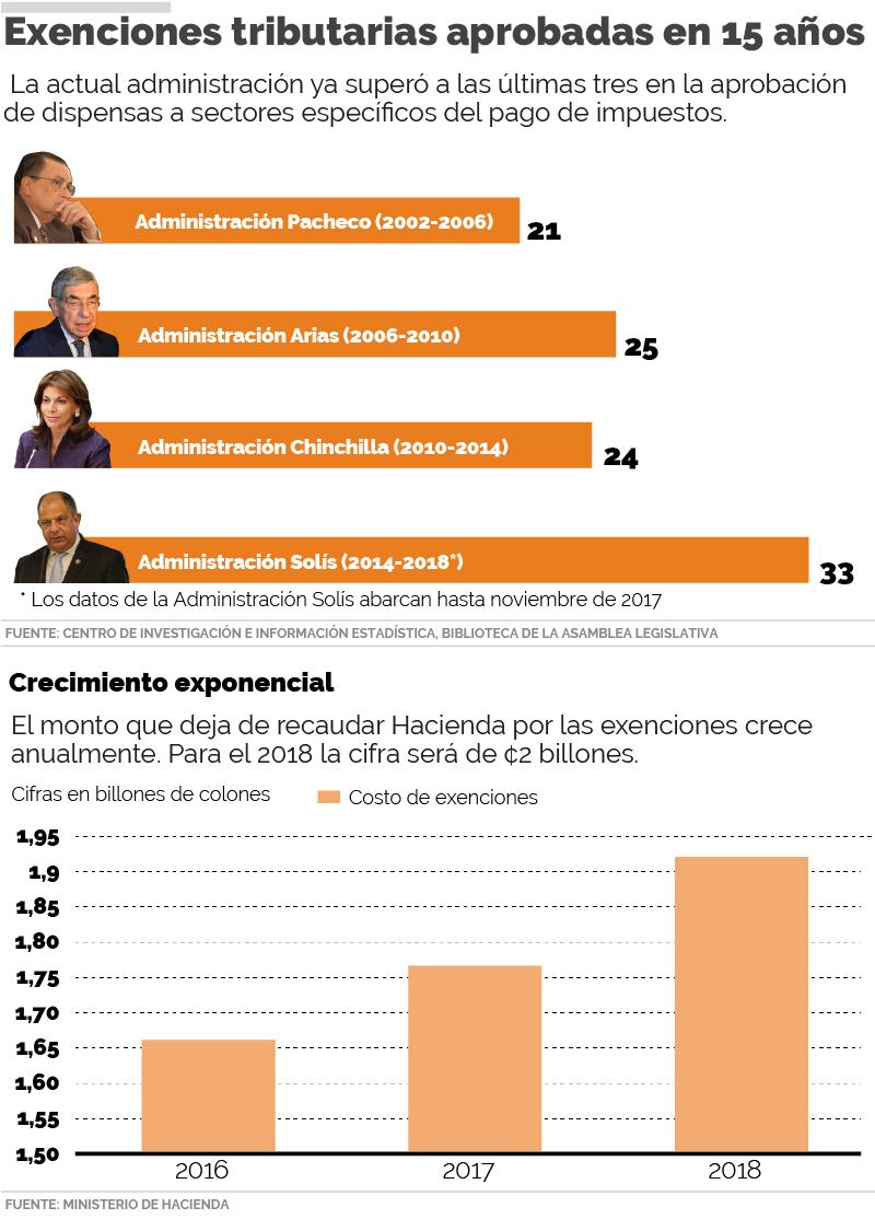 Dichas exenciones engrosan una larga lista de beneficios tributarios que se viene abultando y que el año entrante, según datos del Ministerio de Hacienda, provocará que el Gobierno deje de recaudar cerca de ¢2 billones.