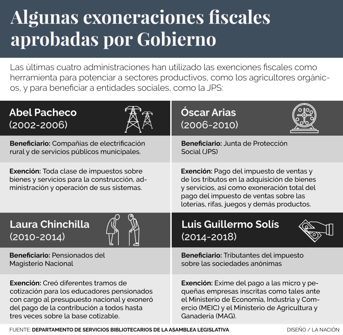 También figuran las que se promovieron durante la segunda administración de Óscar Arias para exonerar del pago del impuesto de ventas sobre las loterías a la Junta de Protección Social (JPS) y para eximir al aguinaldo escolar del tributo sobre la renta. Según Hacienda, ambas han sido de las que más han afectado la recaudación.