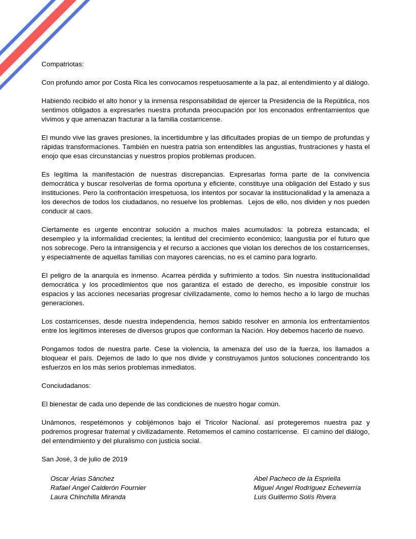 El documento es firmado por Óscar Arias (1986-1990, 2006-2010), Rafael Ángel Calderón (1990-1994), Miguel Ángel Rodríguez (1998-2002), Abel Pacheco (2002-2006), Laura Chinchilla (2010-2014), Luis Guillermo Solís (2014-2018). Solo el expresidente José María Figueres (1994-1998) no lo firma.