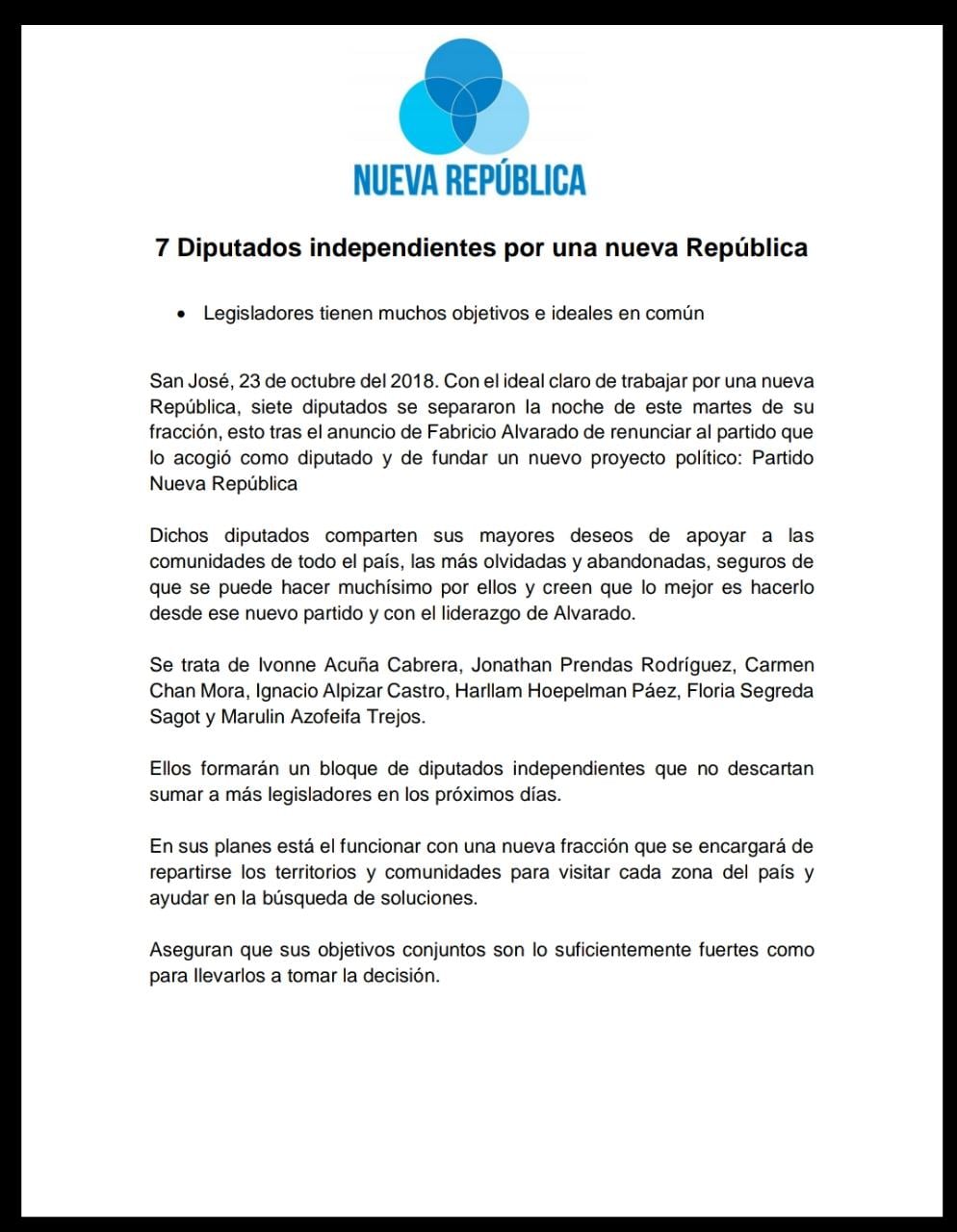 Luego del anuncio de Alvarado, el diputado Jonathan Prendas anunció, a través de un comunicado de prensa, que la mitad de la fracción de Restauración Nacional se irá con la nueva agrupación, al declararse independientes.