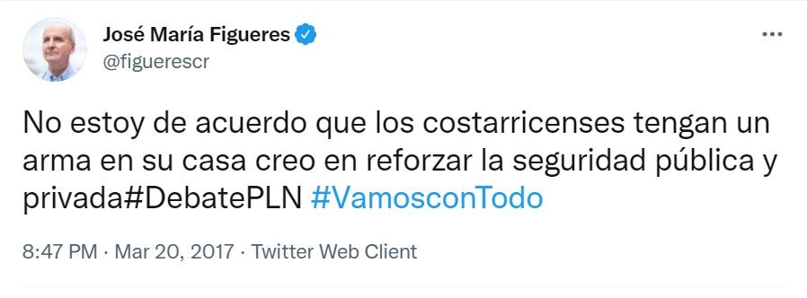 En un tweet publicado el mismo día del debate, el 20 de marzo del 2017, Figueres reiteró su posición: “No estoy de acuerdo que los costarricenses tengan un arma en su casa, creo en reforzar la seguridad pública y privada”.