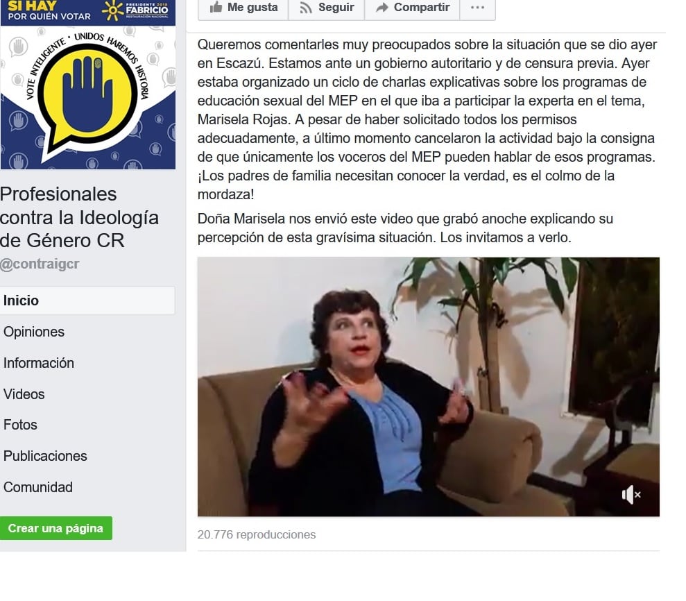 "Queremos comentarles, muy preocupados, sobre la situación que se dio ayer en Escazú. Estamos ante un gobierno autoritario y de censura previa. Ayer estaba organizado un ciclo de charlas explicativas sobre los programas de educación sexual del MEP en el que iba a participar la experta en el tema, Marisela Rojas.