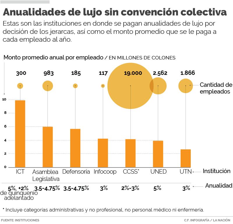 En consecuencia, esta entidad destina casi ¢3.000 millones para cubrir las anualidades de sus 300 empleados, quienes reciben en promedio ¢9,8 millones por año cada uno.