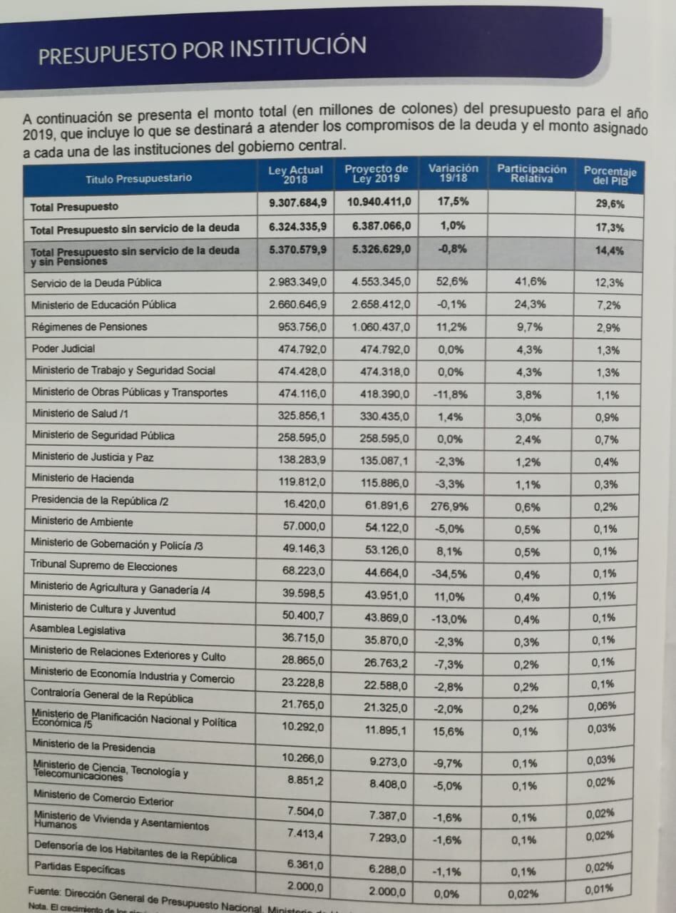 El Ministerio de Hacienda presentó este viernes el Presupuesto Nacional del 2019 por un monto de ¢10,9 billones para financiar los gastos de la Presidencia, 18 ministerios, la Asamblea Legislativa, la Contraloría General de la República, la Defensoría de los Habitantes, el Poder Judicial y el Tribunal Supremo de Elecciones.