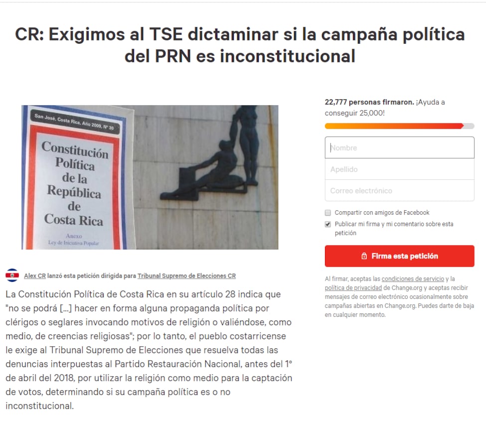 El propio Corrales confirmó a este medio haber firmado la petición, que se encuentra hospedada en el sitio change.org. Explicó que lo hizo después de la primera ronda del 4 de febrero y que su intención era que el Tribunal Supremo de Elecciones (TSE) se pronunciara sobre el uso, "en general", de la religión en la campaña política.